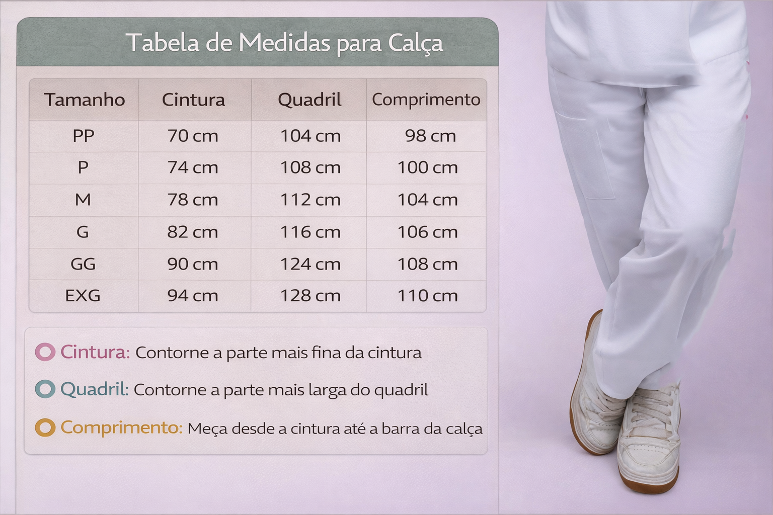 A calça apresenta modelagem confortável e bolsos laterais grandes estilo cargo, perfeitos para carregar acessórios, instrumentos e itens essenciais durante o atendimento.